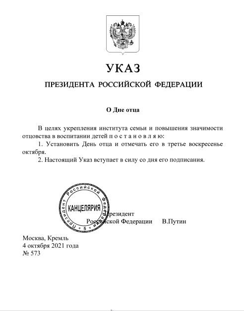 4 октября 2021 года Президент РФ Владимир Путин подписал указ, согласно которому День отца будет отмечаться в России каждое третье воскресенье октября[1][2][3].